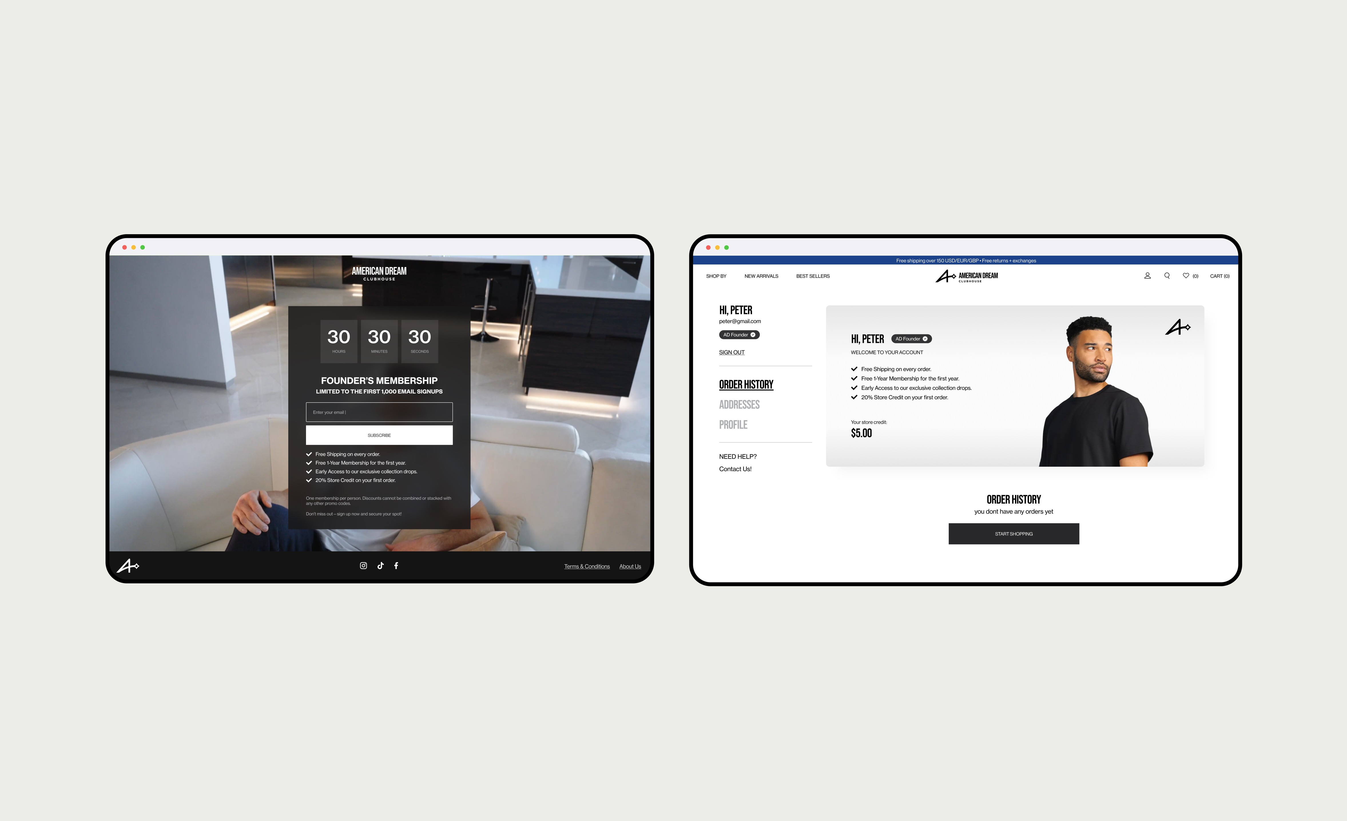 American Dream Clubhouse is a premium men’s apparel brand founded by Chace Crawford. As a new brand, they needed an eCommerce site to launch and start selling online. I led the UX/UI design for the full website, focusing on clear navigation, strong product presentation, and a smooth path to checkout.